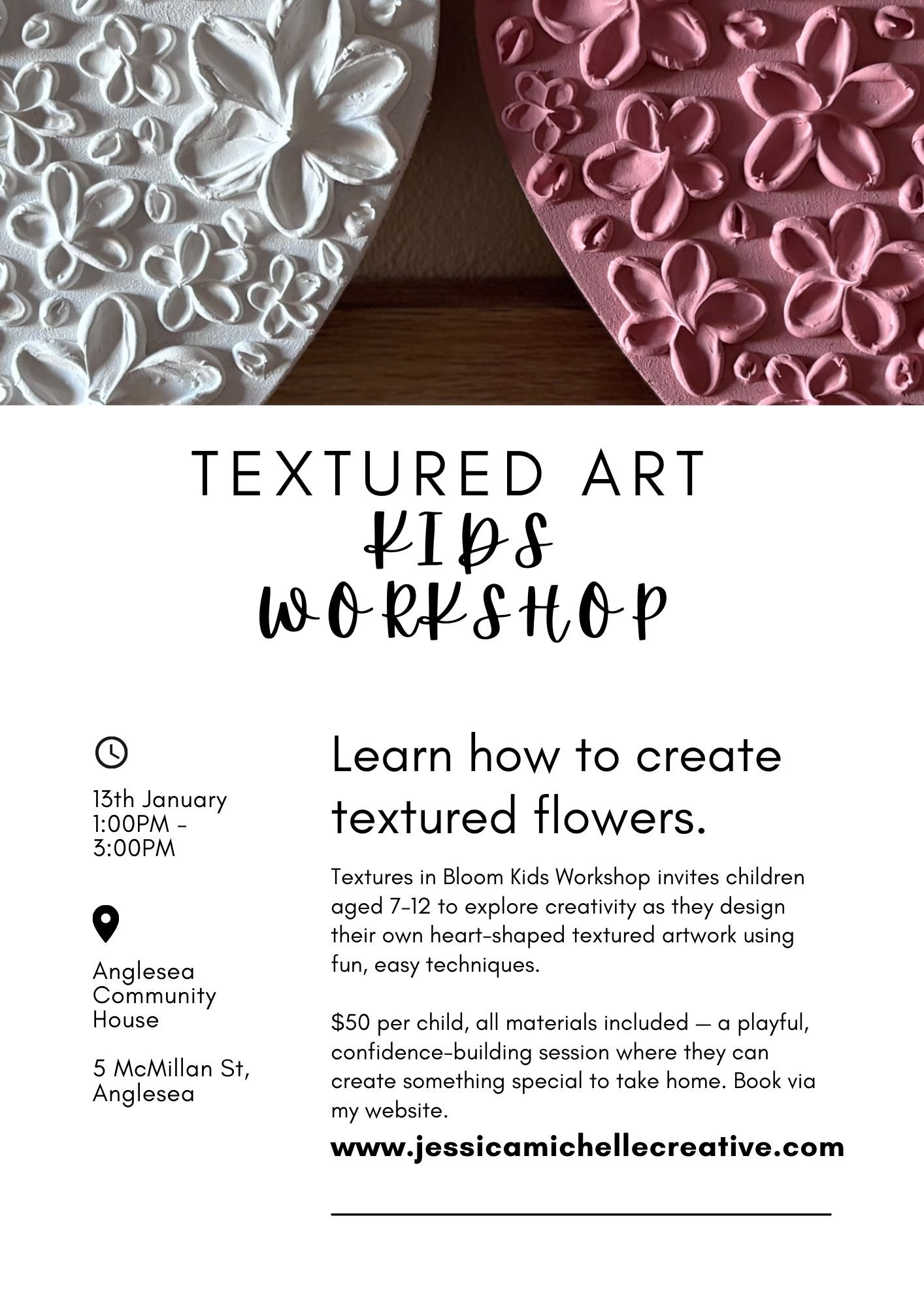 Textures in Bloom Kids Workshop invites children aged 7–12 to explore creativity as they design their own heart-shaped textured artwork using fun, easy techniques.