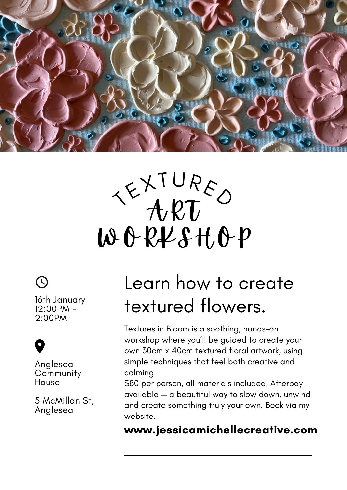 Textures in Bloom is a soothing, hands-on workshop where you’ll be guided to create your own 30cm x 40cm textured floral artwork, using simple techniques that feel both creative and calming.