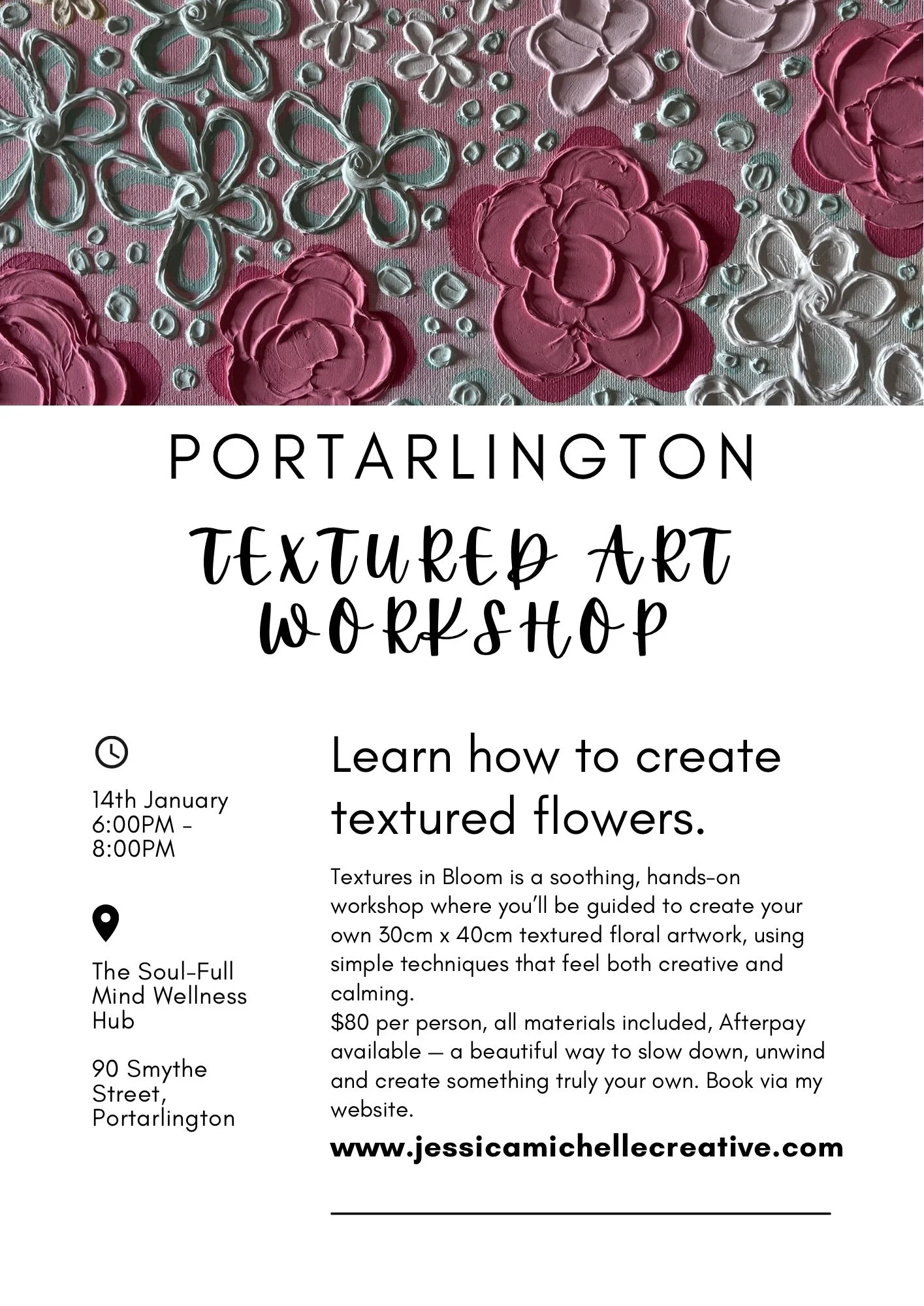 Textures in Bloom is a soothing, hands-on workshop where you’ll be guided to create your own 30cm x 40cm textured floral artwork, using simple techniques that feel both creative and calming.